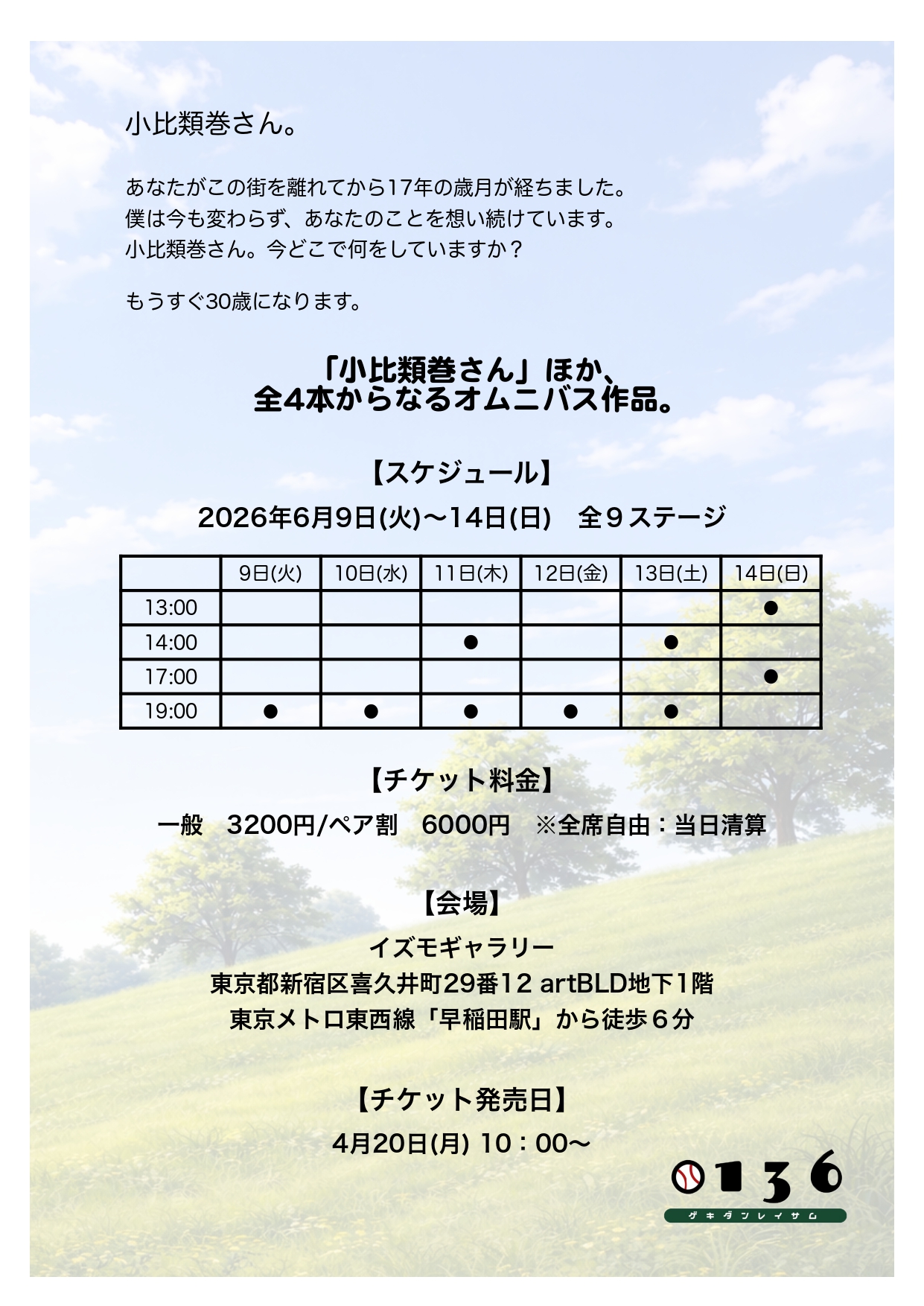 | 開催日時 | 2026年6月9日(火)〜14日(日)全9ステージ 9日(火)19:00 10日(水)19:00 11日(木)14:00 / 19:00 12日(金)19:00 13日(土)14:00 / 19:00 14日(日)13:00 / 17:00 |